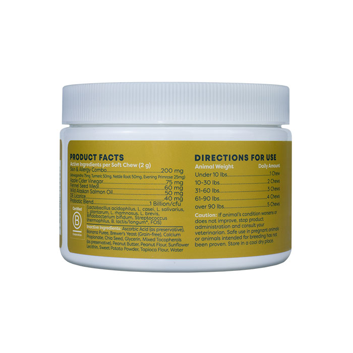 The ALZOO™ Plant-Based Allergy Chews help keep seasonal allergies in check with a potent blend of Wild Alaskan Salmon Oil, Fennel Seed Meal, Apple Cider Vinegar, and Probiotics that support a healthy immune system and histamine response in your dog.